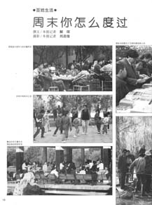 撰文/本报记者 解 琛摄影/本报记者 刘启俊度周末是生活必然,而且,以什么方式度过周末是个人喜好之事,按理说不必多问,但自1995年5月实行每周休两天以后,度周末对中国人就有点儿意义不同了。调查的结果表明,中国人的生活品味和生活质量正在发生着不小的变化。被调查者人数为48人,其中包括了机关干部、学生、职员、工人和无业者。周小姐,16岁 中学生 和父母去姥姥家看望、聚餐;学习绘画。侯先生 64岁 银...